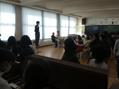 3・4校時に体育館で芸術鑑賞を行いました。今年度は、オペラシアターこんにゃく座の方々に来校いただき、「ロはロボットのロ」というオペラを全校児童が楽しみました。素晴らしい歌やピアノ演奏があり、思わず笑ってしまう場面があり、「おもしろかった。」と感想を言っている児童がたくさんいました。こんにゃく座の皆様、ありがとうございました。